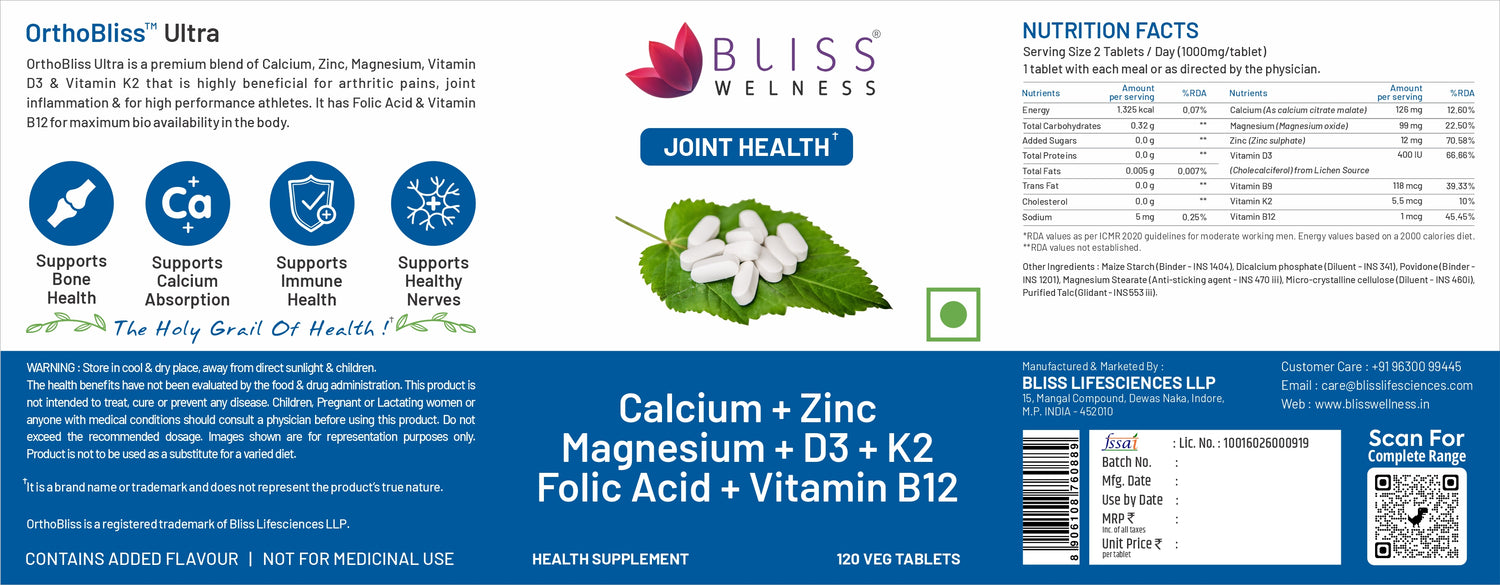 Bliss Welness OrthoBliss Joint care Pain relief tablets | Calcium Magnesium Zinc Vitamin D3 K2 B12 Folic Acid | Bone Strengthening Ayurvedic Health Supplement - 120 Vegetarian Tablets