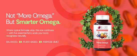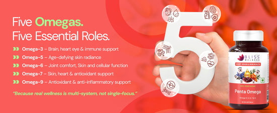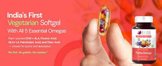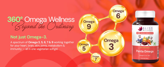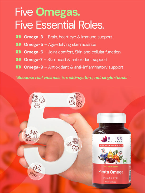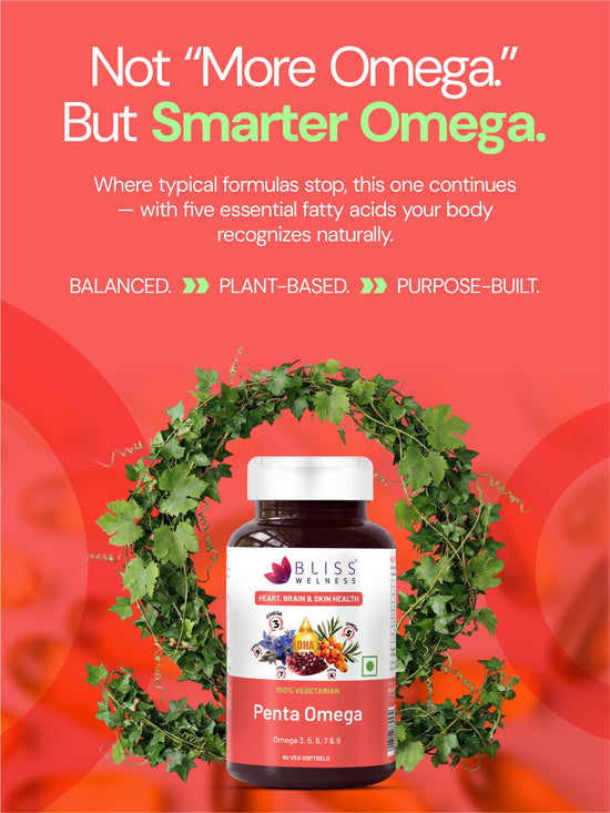 Bliss Welness Penta Omega | 3 5 6 7 9 Fatty Acids Blend with Natural Antioxidants | Advanced Formula for Heart, Brain, Skin, Joints & Metabolism | 60 Softgels | Vegetarian Source