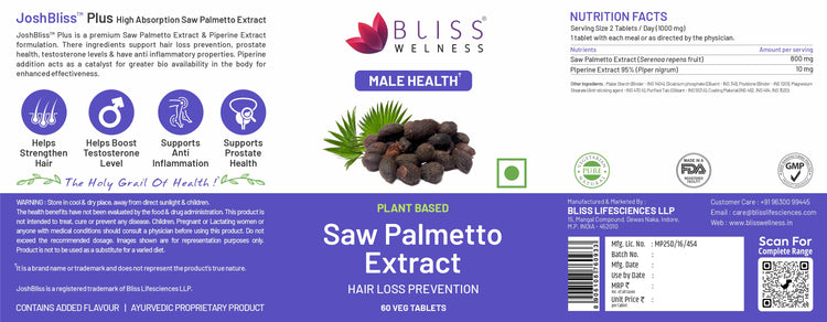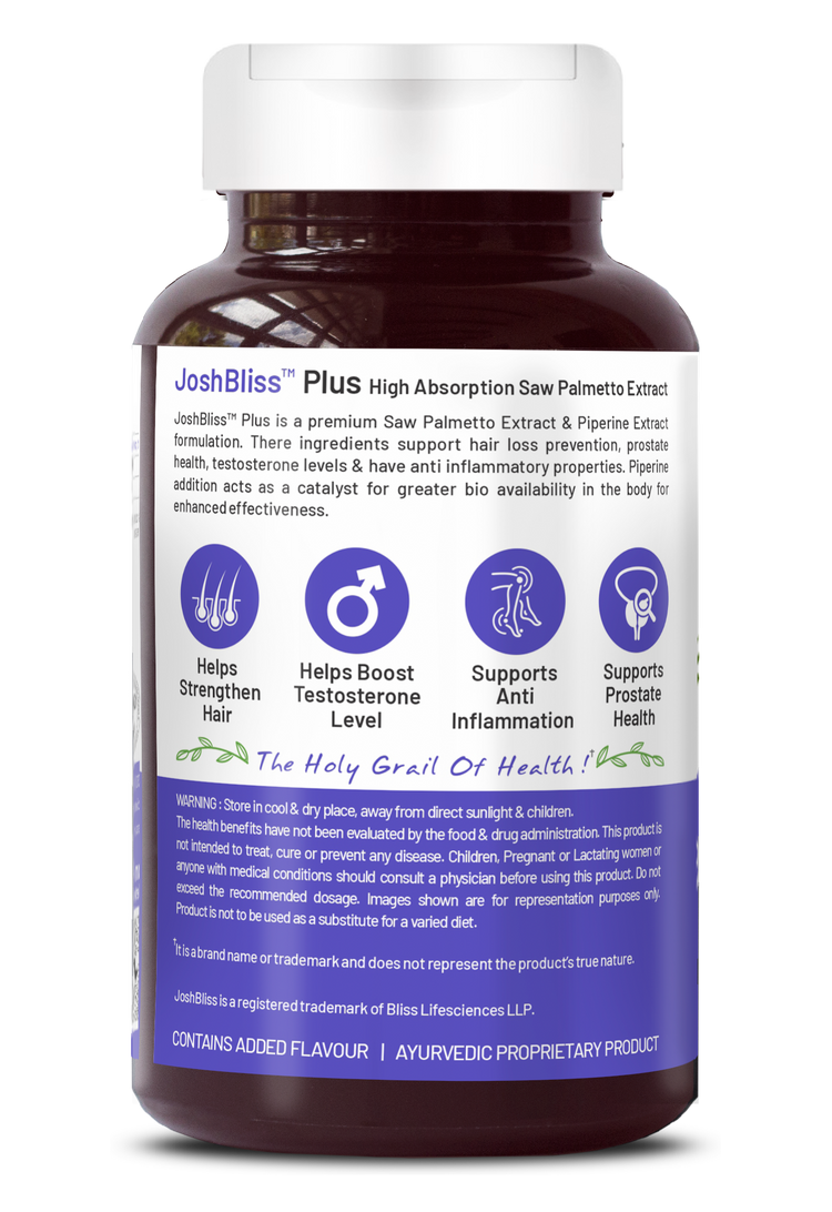 Bliss Welness JoshBliss Plus Prostate Health Healthy Hair Growth | Saw Palmetto Extract 800MG | Testosterone Booster Strong Hair Healthy Prostate Health Supplement- 60 Vegetarian Tablets