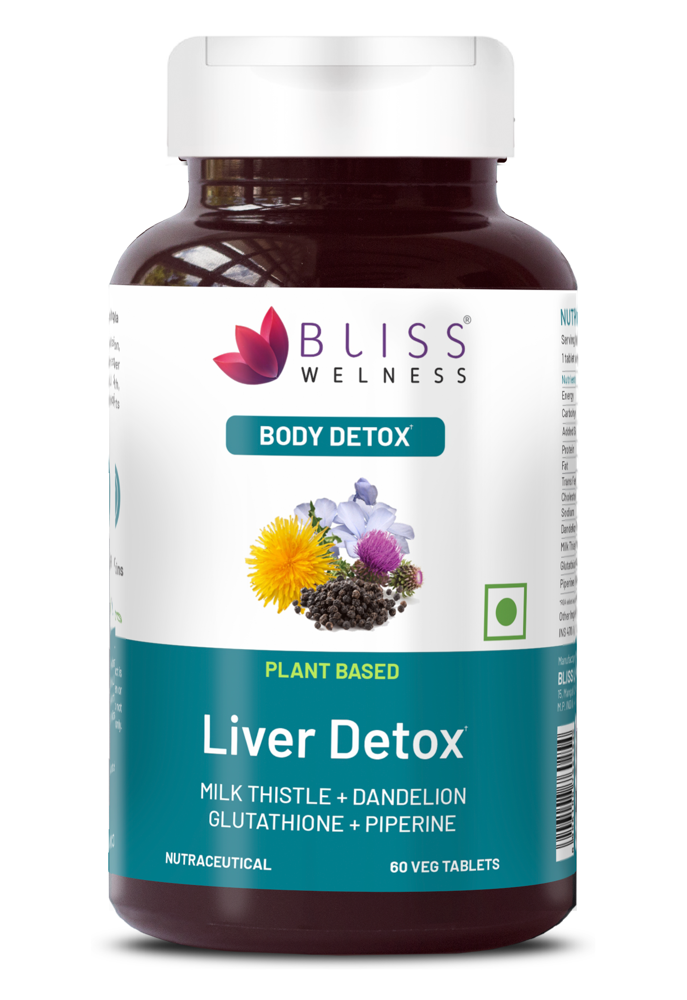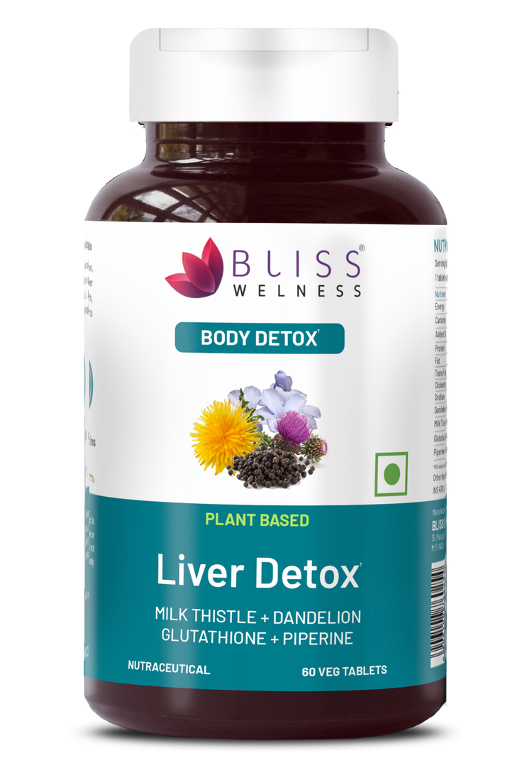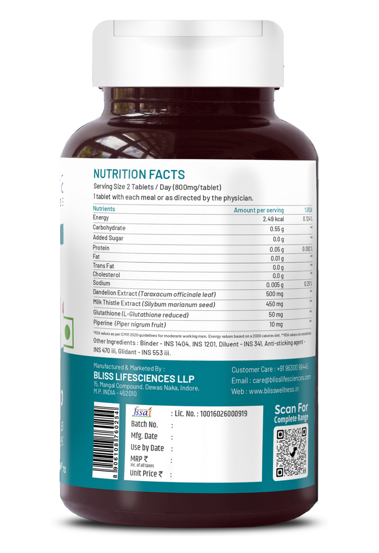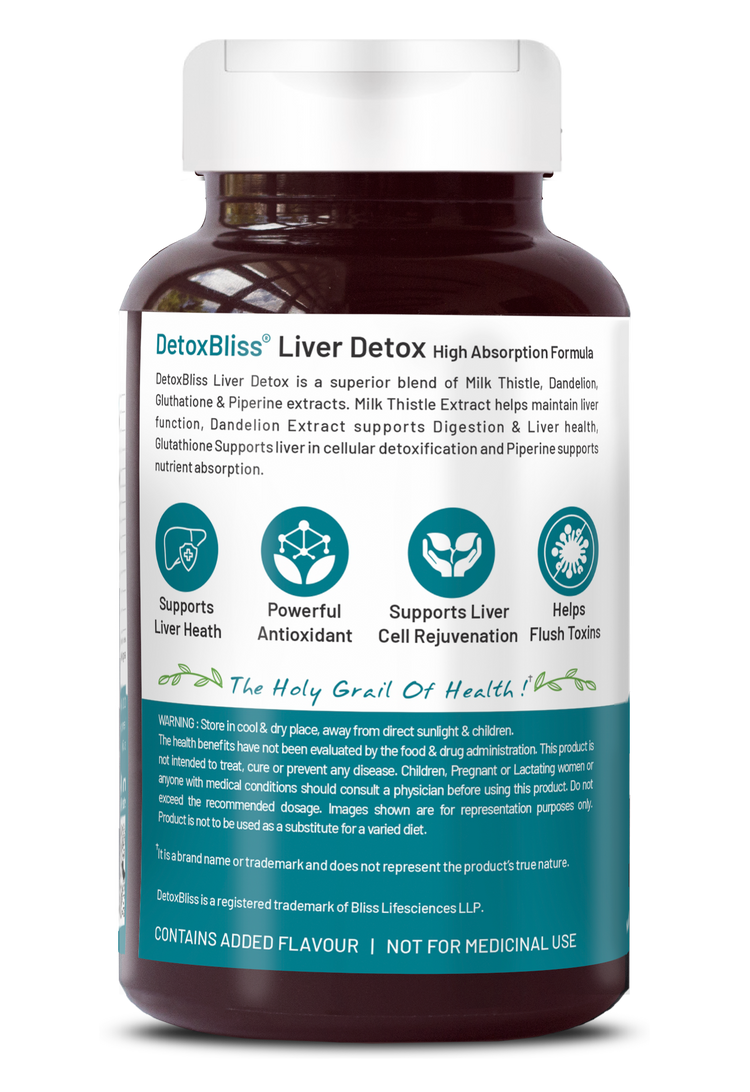 Bliss Welness DetoxBliss Liver Detox Cleanse Purifier | Milk Thistle Silymarin Dandelion Glutathione | Fatty Liver Protection Liver Care Alcohol Detox Herbal Supplement - 60 Veg Tablets