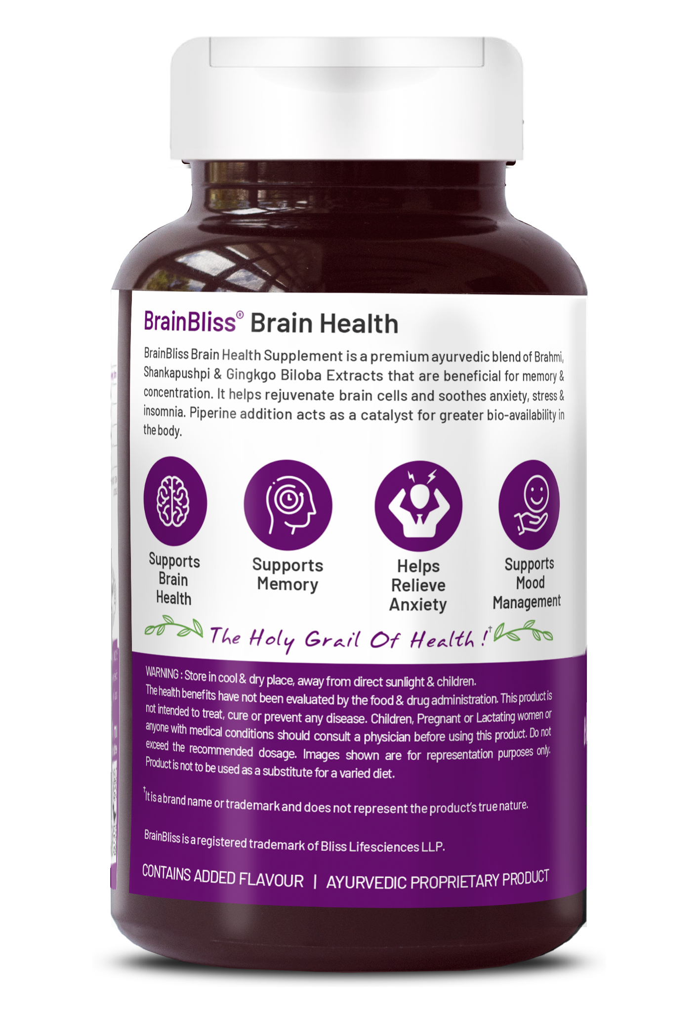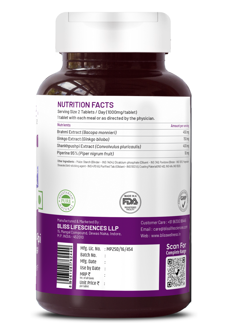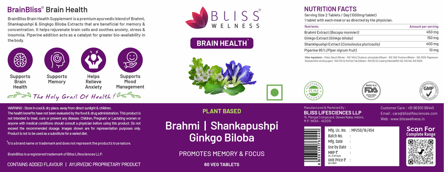 Brain Bliss is a natural brain health supplement designed to support memory, focus, and overall cognitive function. It combines potent ingredients like Brahmi, Shankhpushpi, Ginkgo Biloba, and Piperine for enhanced brain performance.