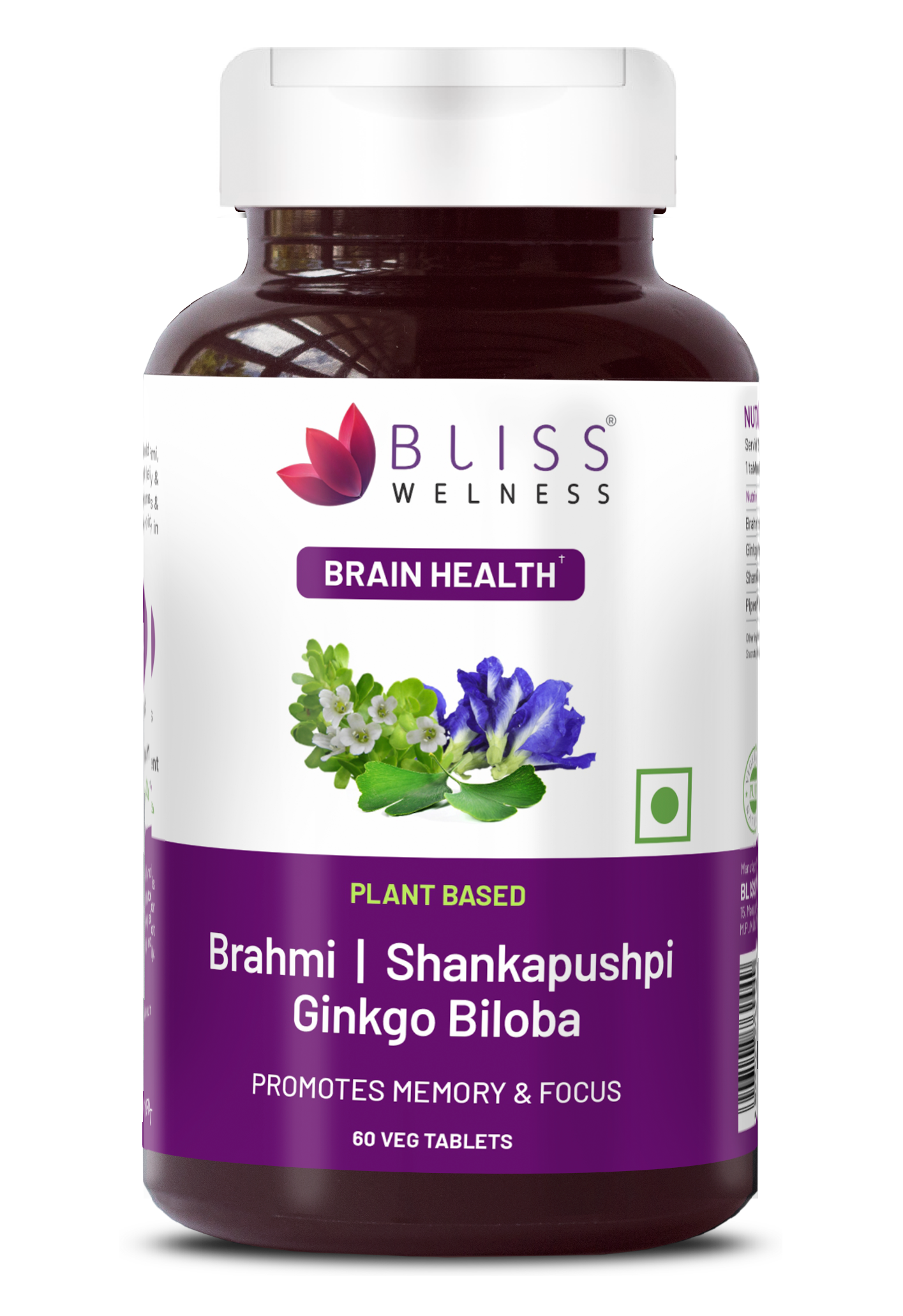 Bliss Welness BrainBliss health tablet for Memory Focus Mood | Brahmi Shankpushpi Ginkgo Biloba & Piperine | Cognitive Development Alertness Anti Anxiety Supplement - 60 Veg Tablets