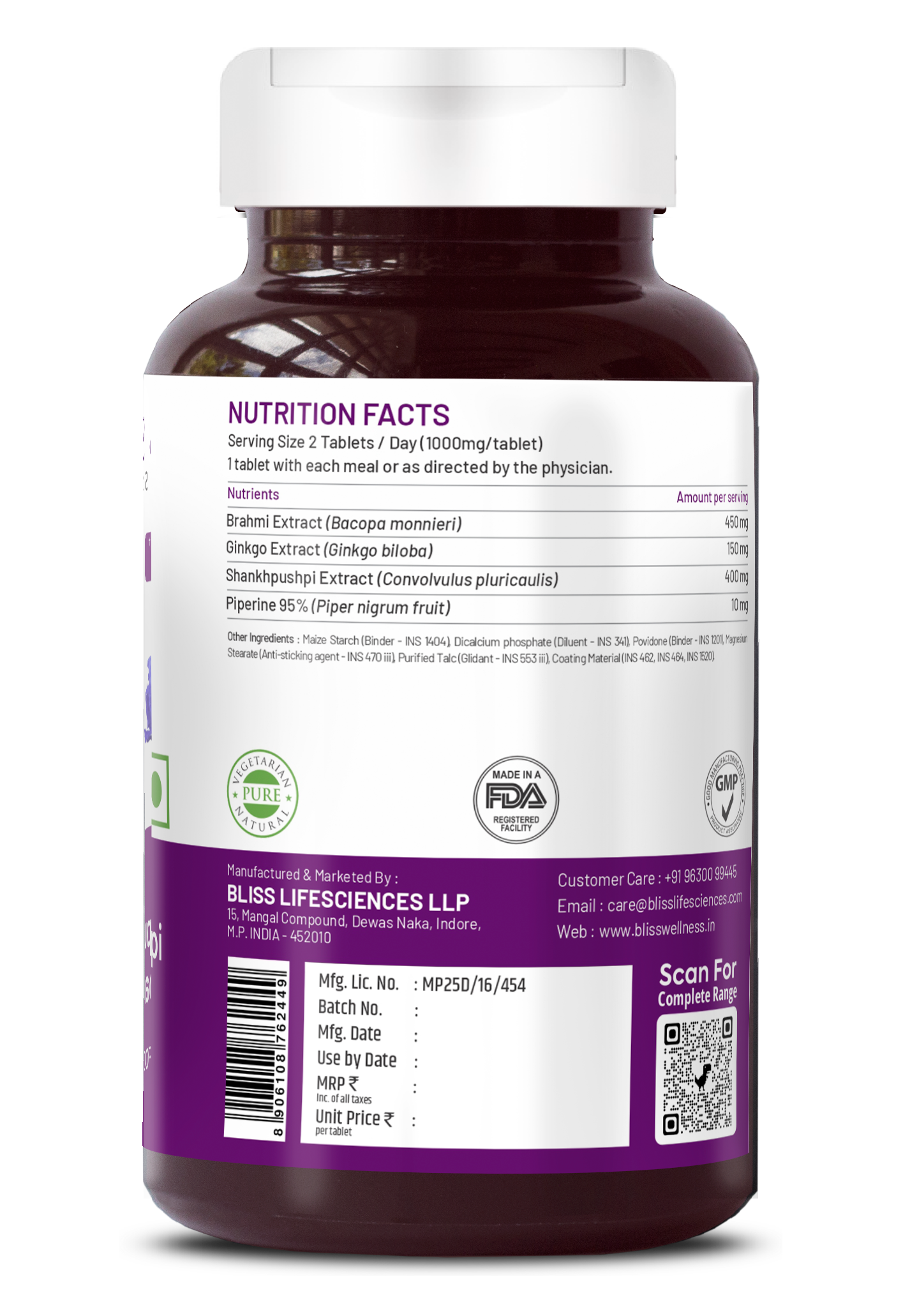Brahmi, Shankpushpi, Ginkgo Biloba, Piperine, Hypromellose (HPMC) Plant-derived Capsules