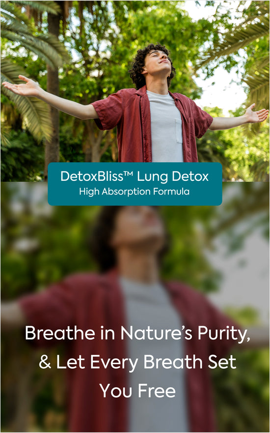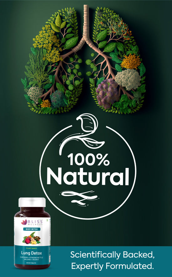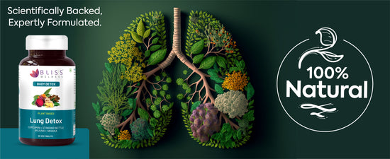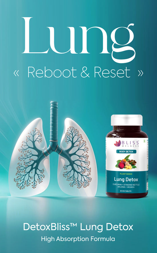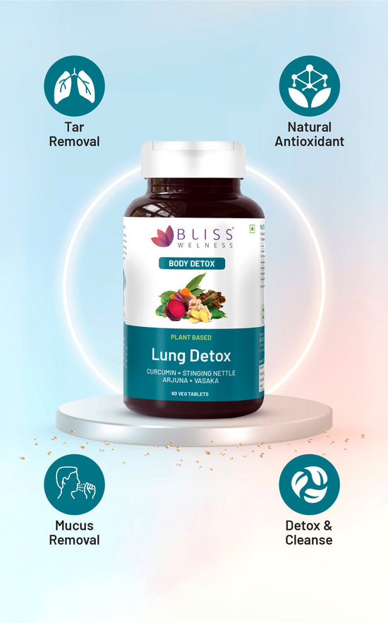 Bliss Welness Lung Detox is an Ayurvedic supplement designed to support respiratory health, detoxify the lungs, and clear excess mucus. It combines powerful ingredients like extracts of Curcumin, Beetroot, Ginger, Vasaka, Arjuna, and Piperine to promote overall lung health and improve breathing.