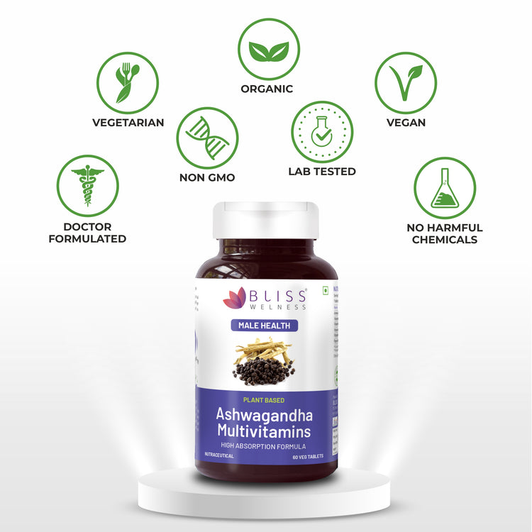 A bottle of Bliss Welness Male Health Ashwagandha Multivitamins, with a visual representation of ashwagandha root in front of the bottle. ashwagandha shilajit tablet capsule aswagandhada aswagandha premature ejaculation testosterone booster sex stamina multivitamin stress relief boost nutrition facts ashwagandha+multivitamins nutrition facts