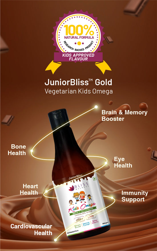 Bliss Welness JuniorBliss Gold Kids Omega 3 6 9 with Omega 3 300MG (DHA 100mg EPA 30mg ALA 170mg) Vitamin A C D E Multivitamin Supplement- Chocolate Flavor Syrup
