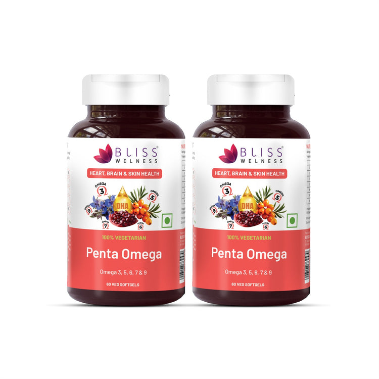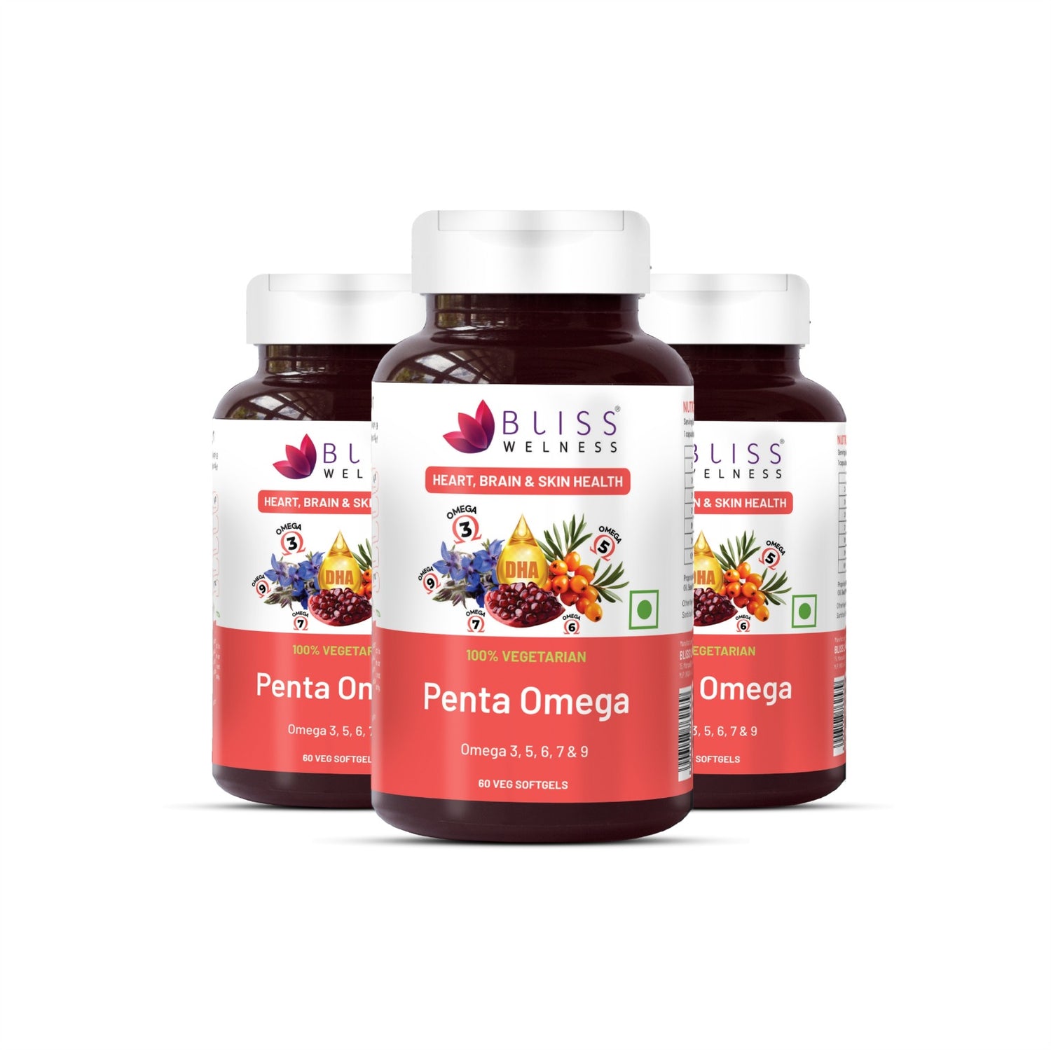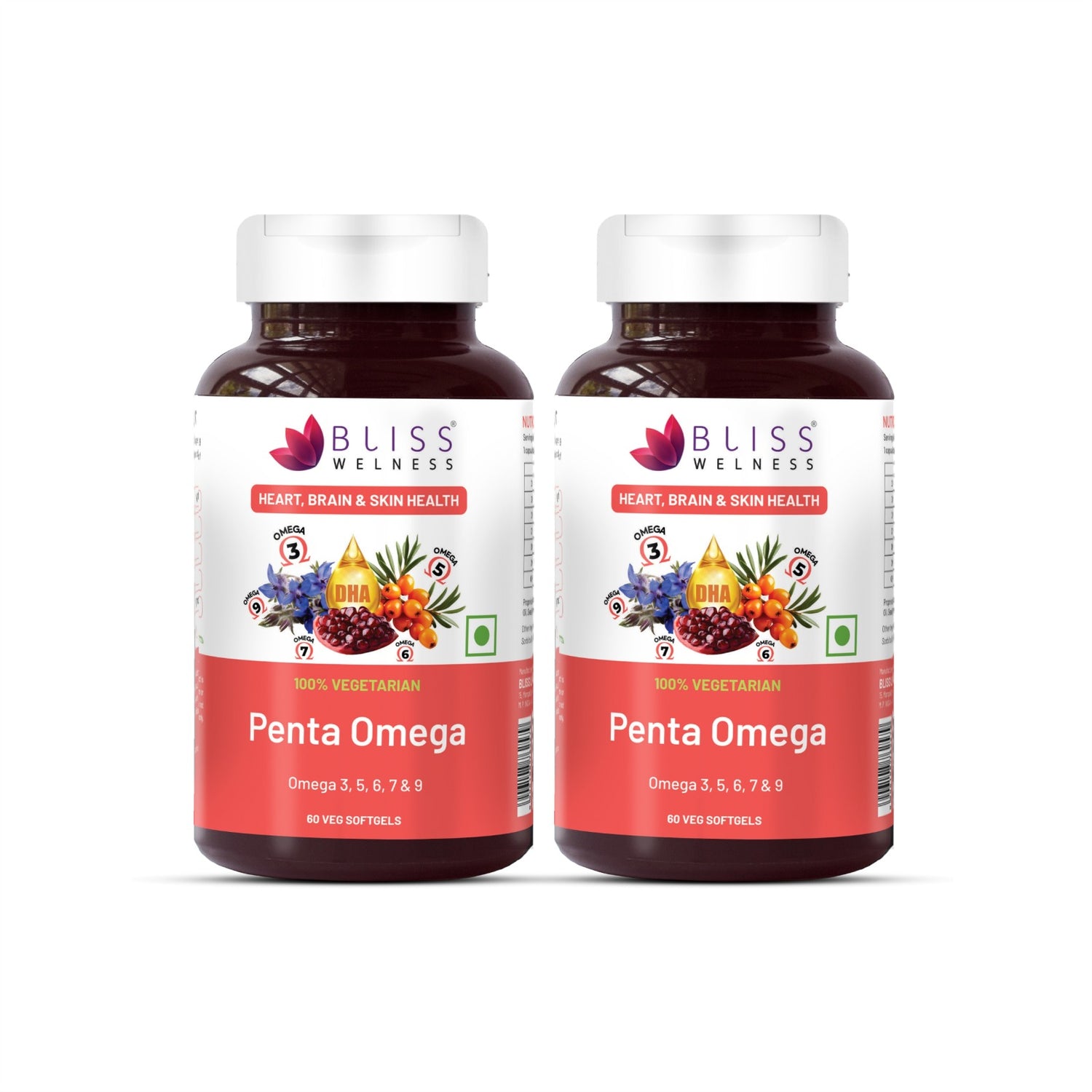 Bliss Welness Penta Omega | 3 5 6 7 9 Fatty Acids Blend with Natural Antioxidants | Advanced Formula for Heart, Brain, Skin, Joints & Metabolism | 60 Softgels | Vegetarian Source