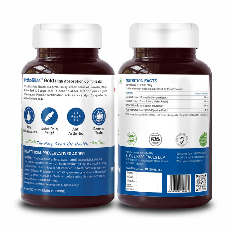Bliss Welness OrthoBliss Gold High Absorption Joint Care Pain Relief | Boswellia White Willow Bark Guggul & Piperine | Anti-Inflammatory Gout Arthritic Spondylitis Care - 60 Vegetarian Tablets