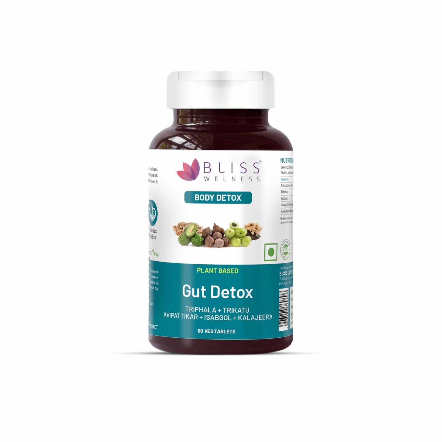 DetoxBliss Gut Detox is a herbal supplement that promotes gut health, improves digestion, and supports toxin removal. It contains Probiotics, Trikatu, Triphala, and Avipattikar for comprehensive digestive health.