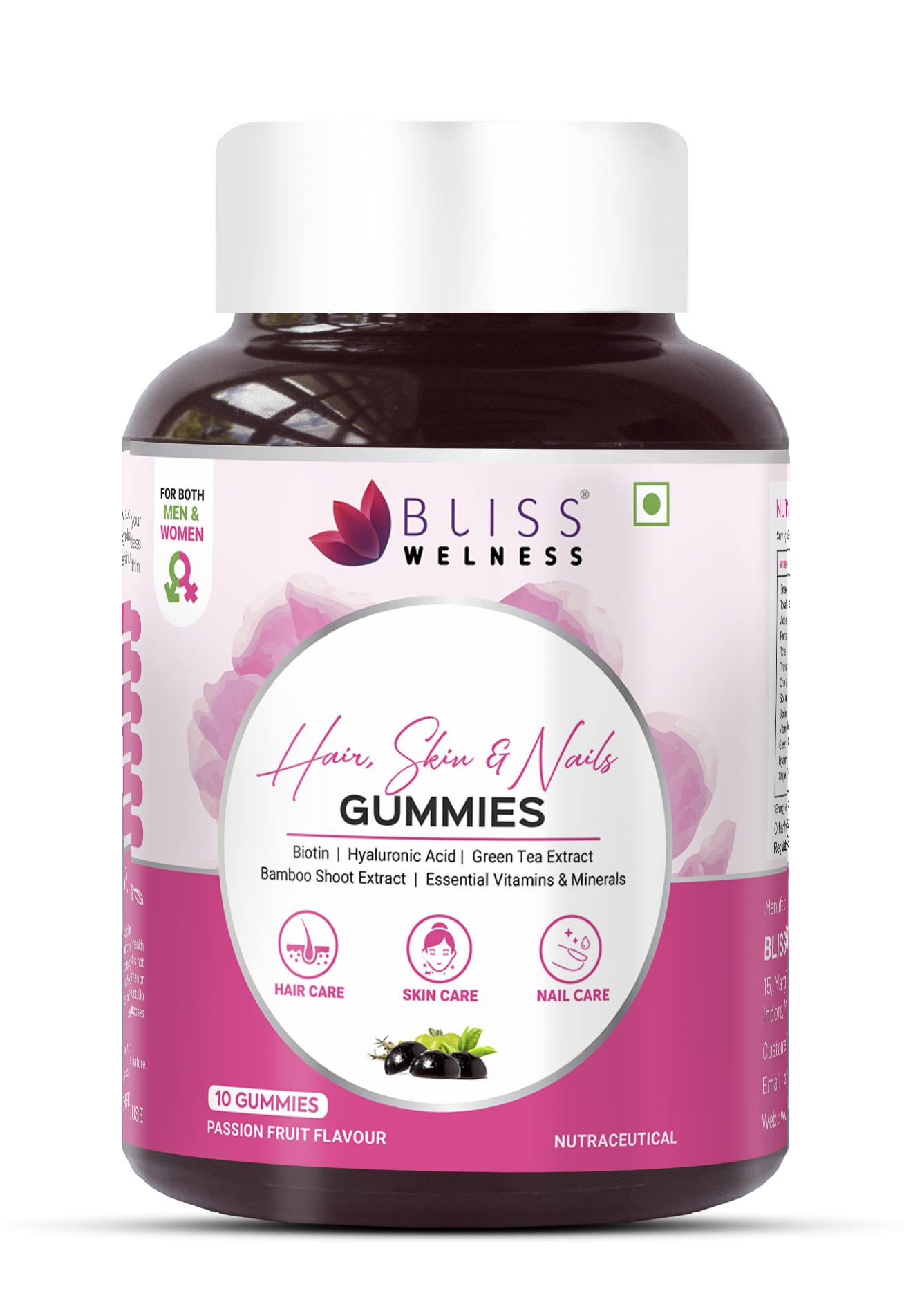 The Bliss Wellness Hair, Skin & Nail Gummies offer daily beauty nutrition with a powerful blend of Biotin (40 mcg) and essential vitamins A, C, E, D2, B6, B9, and B12, designed to enhance your everyday self-care routine from within. Enriched with Amla and Hyaluronic Acid, these gummies help maintain glowing, youthful, and hydrated skin by supporting collagen formation, improving blood flow, and preventing age-related skin concerns. With Zinc (3 mg) and Folate (58.8 mcg) per serving, they provide consistent nail health support, helping maintain nail strength and overall nutrient balance in the body. The formulation also features a botanical blend of antioxidant-rich extracts including Green Tea, Aloe Vera, Grape Seed, Rosehip, Sea Buckthorn, and Sesbania, traditionally known to support skin wellness and antioxidant activity. Combining essential vitamins and minerals in a complete multivitamin format, these gummies are a convenient and comprehensive addition to a beauty-focused daily supplement plan, promoting radiant skin, strong nails, and healthy hair.