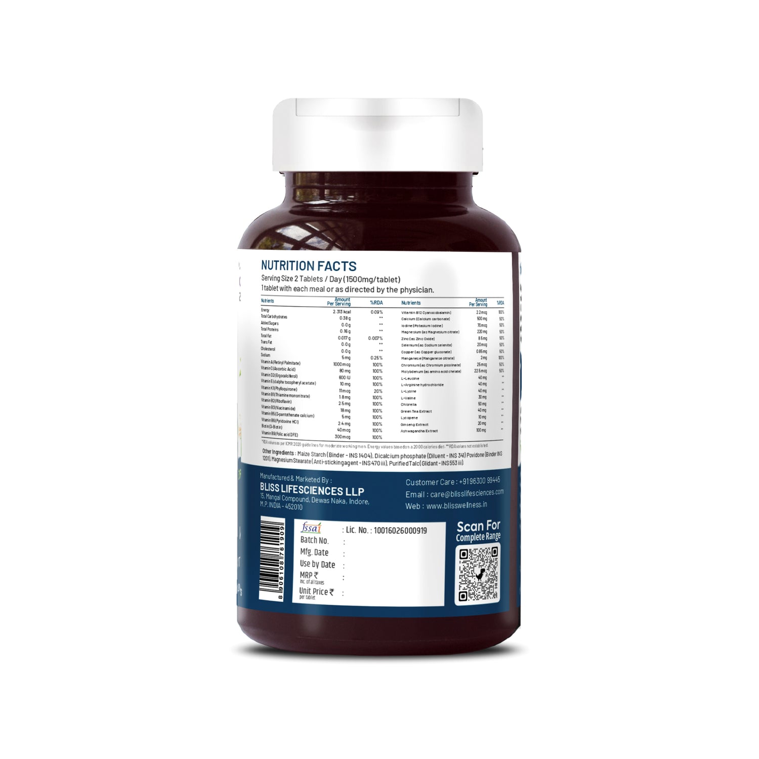 Energy Improver: Enriched with Vitamins A, D, E & K2, VitaBliss Men’s Multivitamin maintains body vitals and sustains male energy to stay active.  Vitamins B1, B2, B3, B6, and B12 in the supplement actively maintain the energy levels & fasten metabolism.