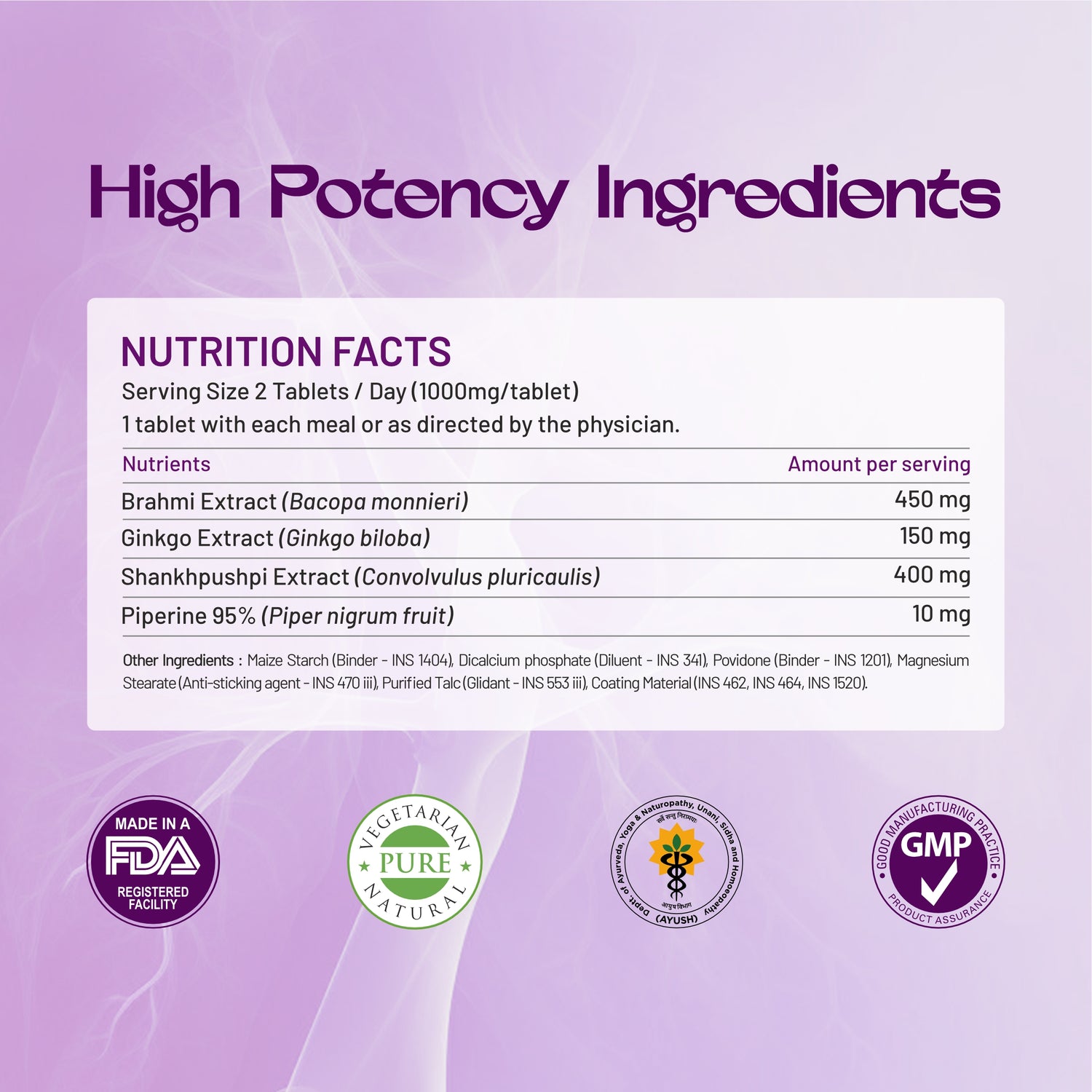 Brahmi, Shankpushpi, Ginkgo Biloba, Piperine, Hypromellose (HPMC) Plant-derived Capsules