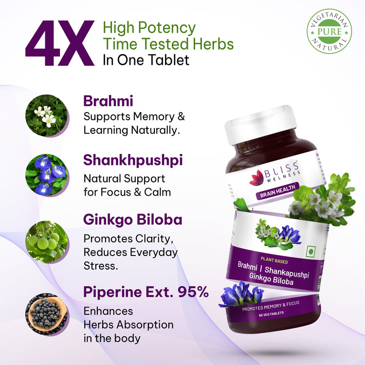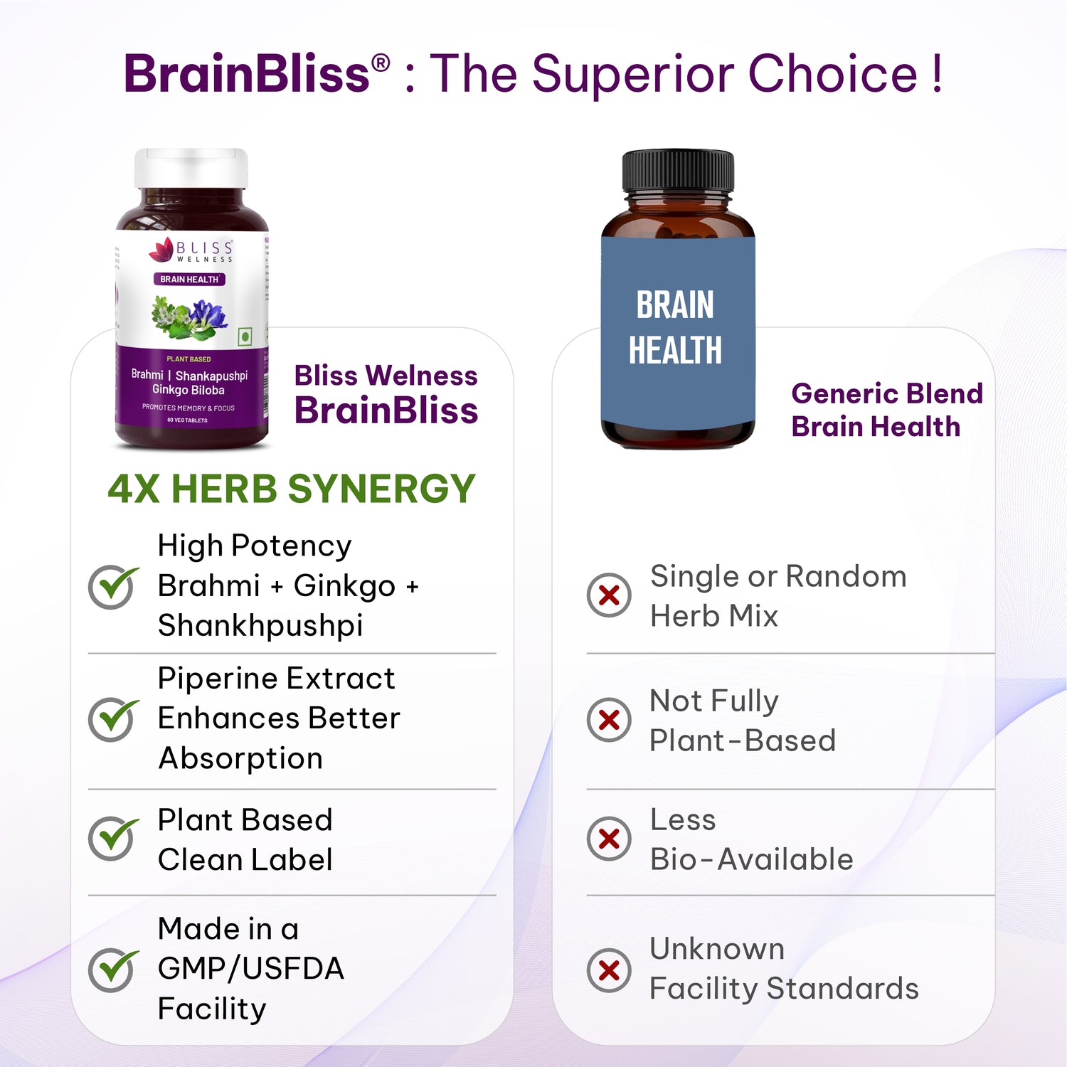 Bliss Welness BrainBliss health tablet for Memory Focus Mood | Brahmi Shankpushpi Ginkgo Biloba & Piperine | Cognitive Development Alertness Anti Anxiety Supplement - 60 Veg Tablets