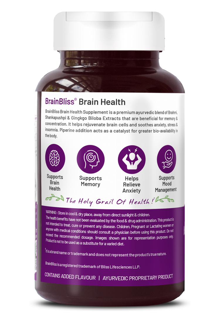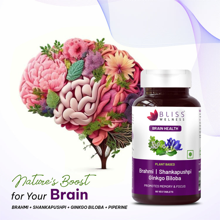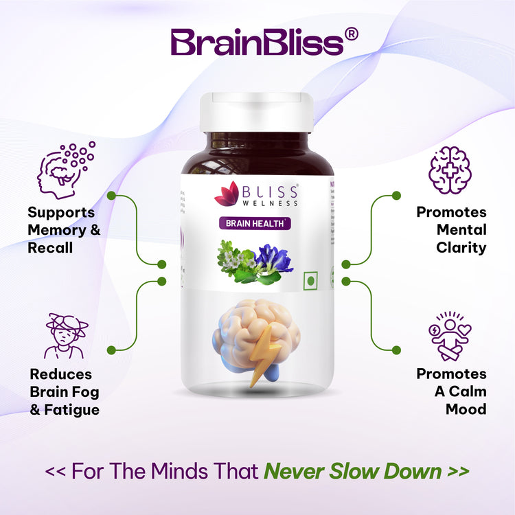Brain Bliss is a natural brain health supplement designed to support memory, focus, and overall cognitive function. It combines potent ingredients like Brahmi, Shankhpushpi, Ginkgo Biloba, and Piperine for enhanced brain performance.