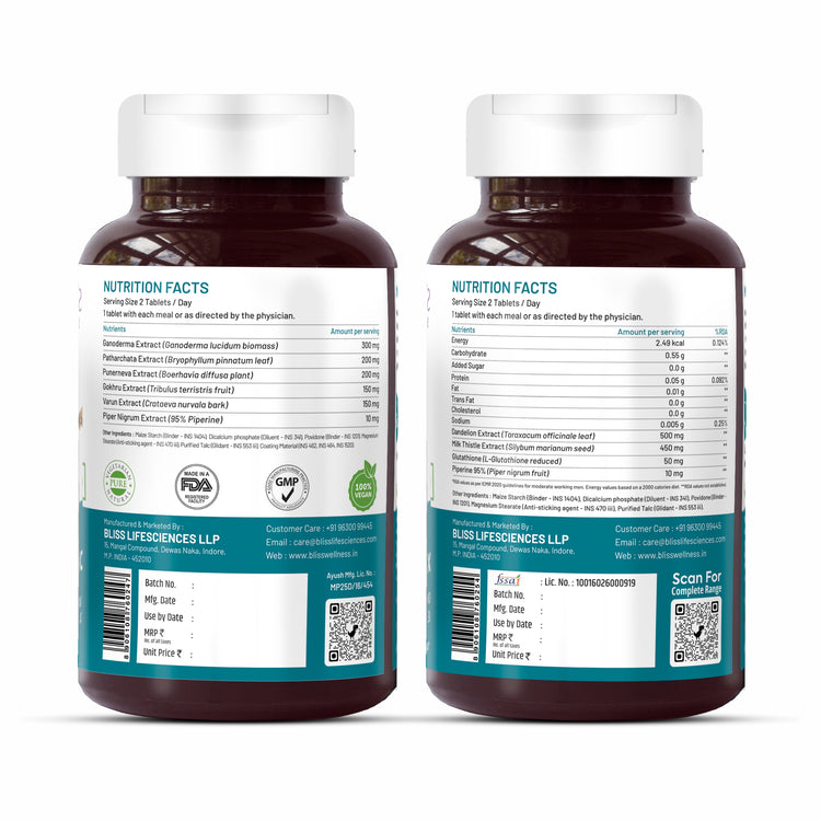 Bliss Welness Kidney DetoxBliss Cleanse Purifier | Gokhru Patharchata Ganoderma + Liver Detox Cleanse Purifier | Milk Thistle Silymarin Dandelion Glutathione - 60+60 Veg Tablets